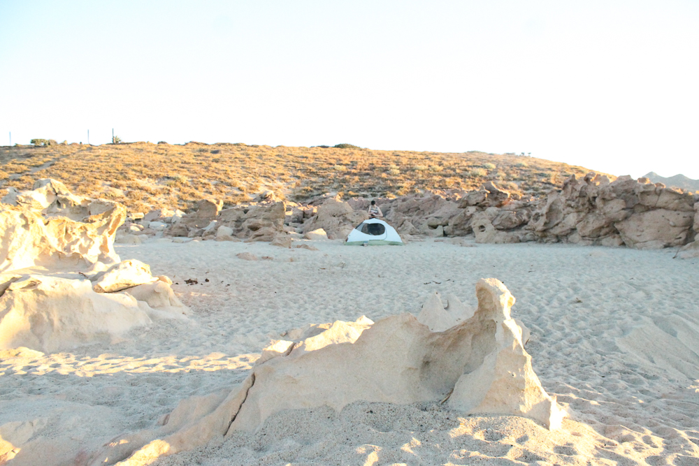 We pulled up next to a small B&B, threw on bathing suites, and ran to the beach. The surf was awesome, really steep, with big waves. We were able to start at the top of the sand and throw our bodies into the cascading waves. The sun was getting ready to set and we needed to figure out our plans for sleeping. My friend went up to some fisherman on the beach to ask about camping on the beach. They told us to try going to the end of the beach by some cool rocks. We grabbed all our stuff and walked 15 minutes to find a small hideout perfect for camping. We set up our tent, and then walked back to the B&B where we had dinner.